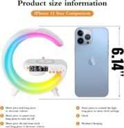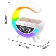 ساعة ديجيتال متعددة الوظائف بتصميم G Shape عصري، تجمع بين منبه، شاشة LED واضحة، إضاءة محيطية RGB مبهرة، سماعة بلوتوث، وشاحن لاسلكي سريع. قطعة ديكور عملية تضيف لمسة جمالية لغرفتك أو مكتبك