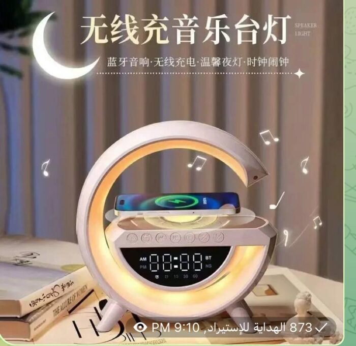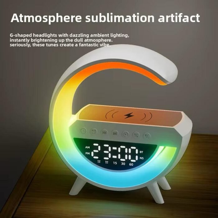 ساعة ديجيتال متعددة الوظائف بتصميم G Shape عصري، تجمع بين منبه، شاشة LED واضحة، إضاءة محيطية RGB مبهرة، سماعة بلوتوث، وشاحن لاسلكي سريع. قطعة ديكور عملية تضيف لمسة جمالية لغرفتك أو مكتبك